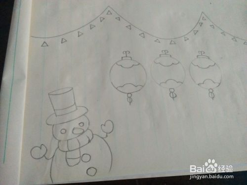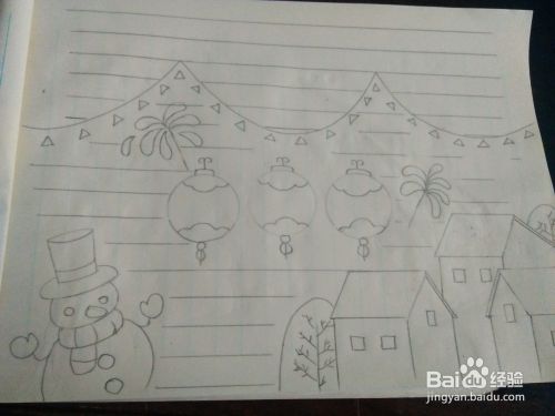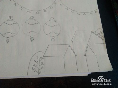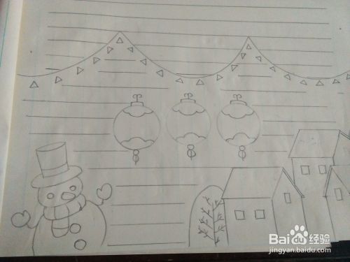 然后我们把灯笼的细节画出来,这都是依照平时见过的灯笼来画的。接下来,在左下角画上一个雪人,代表着冬季吗,因为是新年。