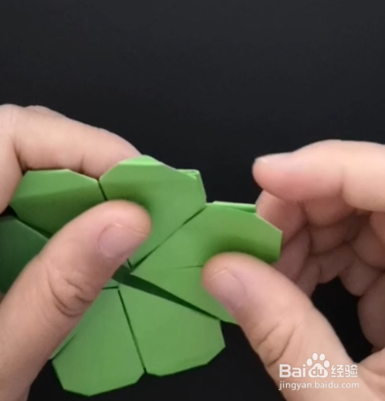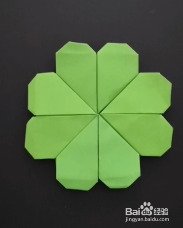 再次翻至另一面,一个叶子就完成了,继续折另外三个,折好后拼在一起,一朵幸运四叶草就完成了。