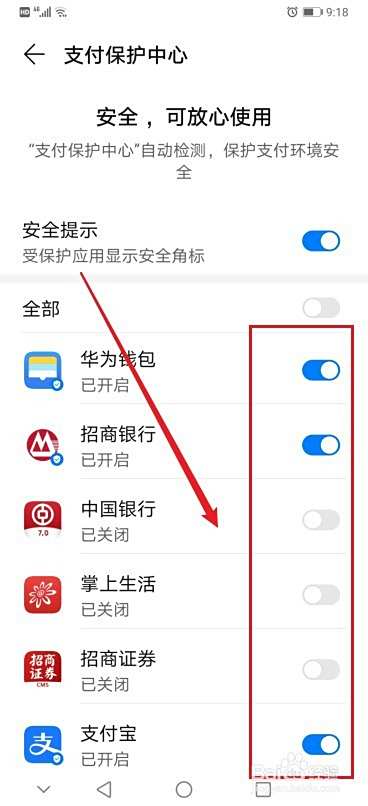 选中应用,将其右侧按钮调整到开启状态,打开支付保护功能,完成设置。