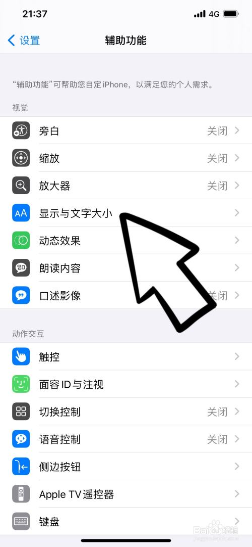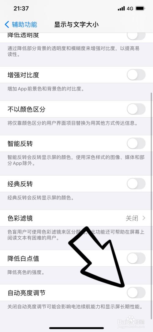 iPhone13设置为不自动调整亮度在设置中找到辅助功能,再找到显示,关闭其中的自动亮度调节。