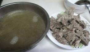 将牛肉捞出,煮牛肉的汤撇去浮沫后也装在一个盆中备用。