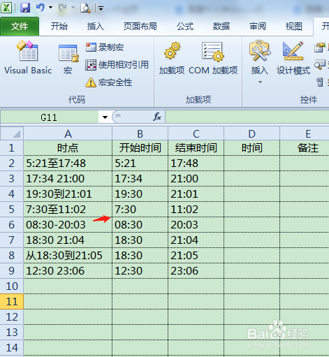 如图所示,通过编写vba代码,将a栏数据中不规范的起止时间提取至b栏和c栏!
