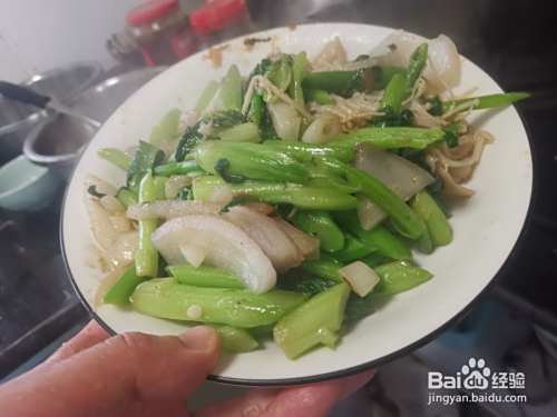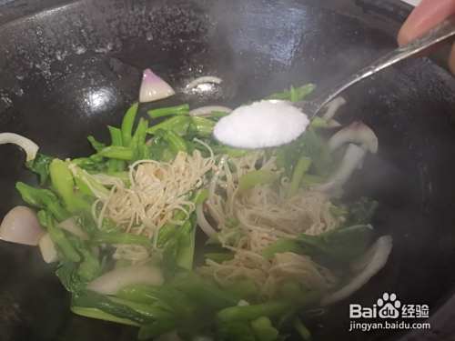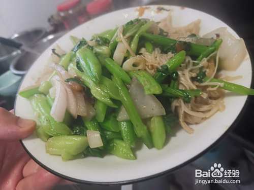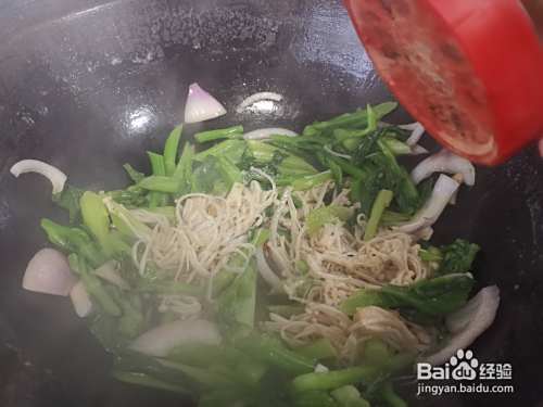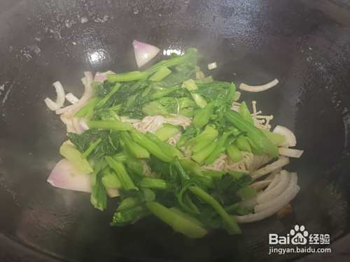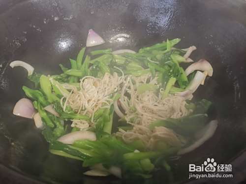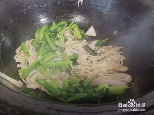 然后下入焯过水的菜薹翻炒,再下入焯过水的金针菇
