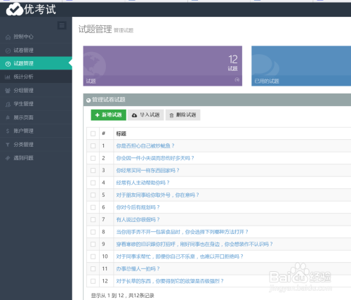 2、点击打开试题管理,我们可以看到有三个功能:1)新增试题;2)导入试题;3)删除试题
