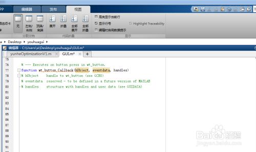 第七步:此时我们将进入m文件中,如下图一所示,我们需要在这按钮函数中编程,将我们需要进行按下按钮后需要运行的程序添加到这里。