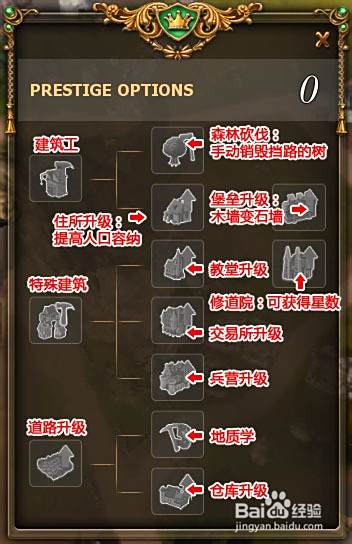 威望点数的使用:特殊建筑->建筑工->住所升级->堡垒升级->道路升级->仓库升级->教堂升级->兵营升级->地质学->修道院->交易所升级