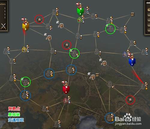 红色为贸易点,很显然属于共享型的贸易点,无法控制。所以一定要尽早占领附近据点,开通你需要的贸易路线,否则别人开通了你就无法使用。