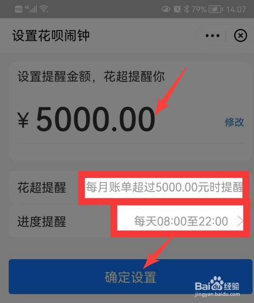 3、点击花呗闹钟按钮,设置金额以及花超提醒和进度提醒,点击确定设置。