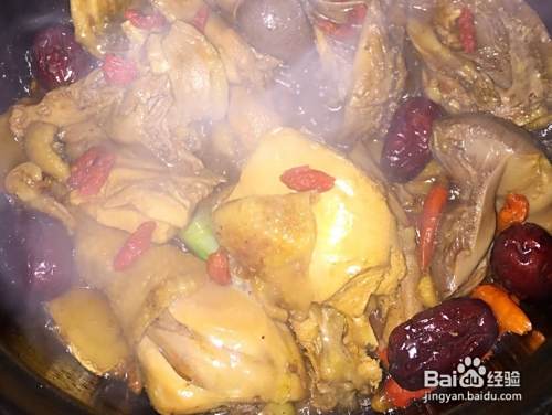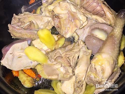 放油,先把姜片.红枣.干辣椒爆炒,再把过了水的鸡块放入砂锅内炒,