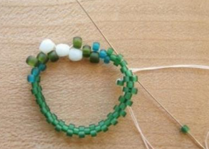 可将珠子放在布料、糙纸等比较粗糙的平面上,防止珠子来回滚动。在穿珠时,渔线、弹力线、铜丝等线材的线头不要伸出太长,一般手指头离线头1~2cm为宜。