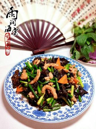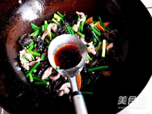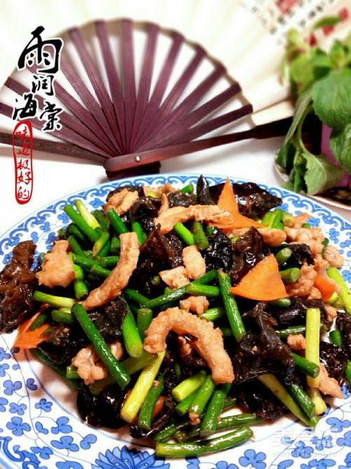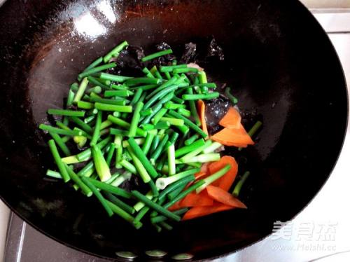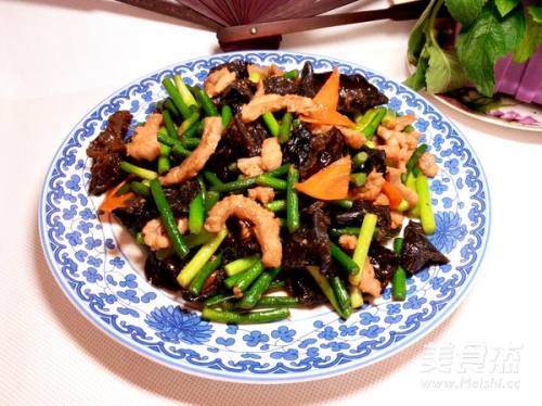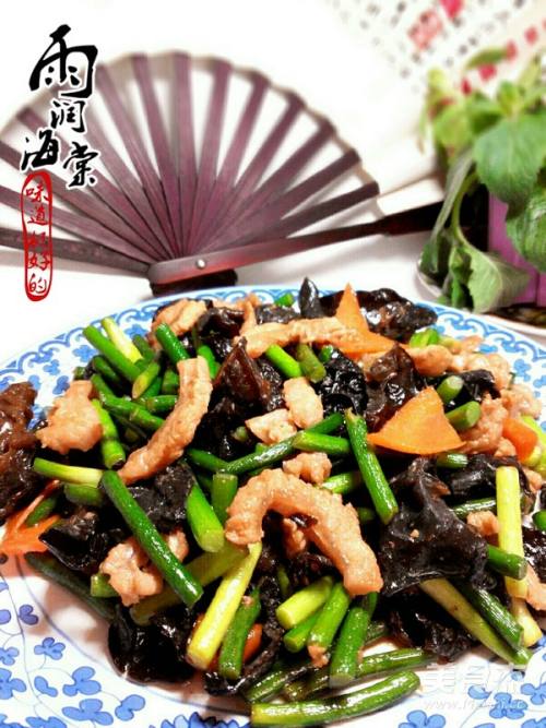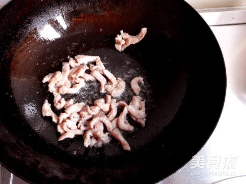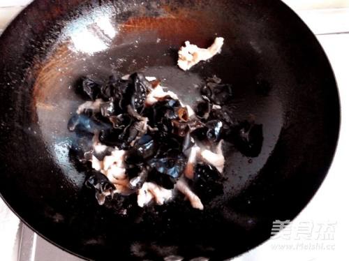 准备食材:木耳提前泡发并用水焯一下,猪肉茄条并用淀粉拌匀