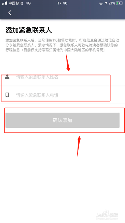 滴滴车主-右上角设置-紧急联系人-输入姓名电话-确认添加成功