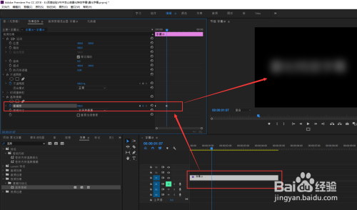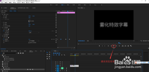 还是保持选中视频轨道1的字幕状态,然后打开效果控件窗口,在效果控件中找到高斯模糊效果,在模糊度上打入一个关键帧,设置模糊数值为200%,然后隔一段时间,将模糊度数值减小直至减到0。点击播放按钮预览整个效果,一个雾化特效字幕就制作完成了。