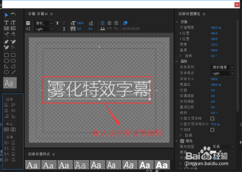 在打开的旧版标题字幕编辑窗口中输入字幕文本内容,并调整文本字幕的文字大小,字号,对齐方式等相应的属性设置。