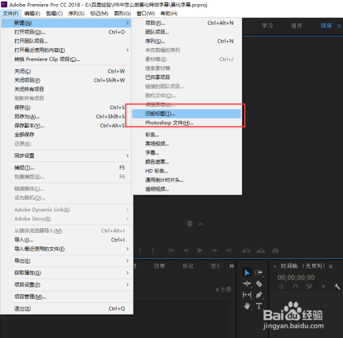 在新建的PR剪辑项目中,选择文件菜单,在文件菜单中选择新建命令,然后在新建中选择旧版标题选项,单击旧版标题创建一个字幕。