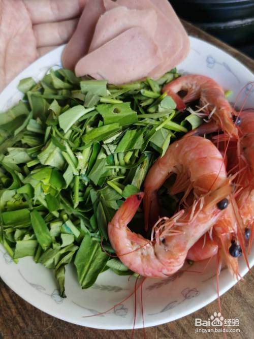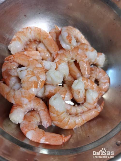 虾煮熟剥去外壳,去头去虾线,虾仁粥,虾仁面都可以。