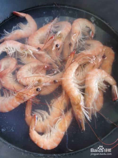 锅内放入清水,姜片,大蒜,料酒,葱结,大火煮开,放入清洗干净的虾煮熟去腥。