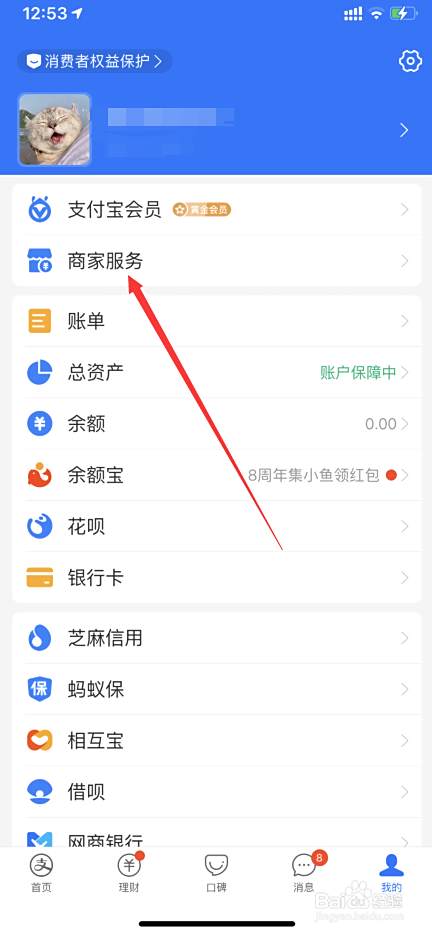 打开进入支付宝后在我的界面中点击商家服务。