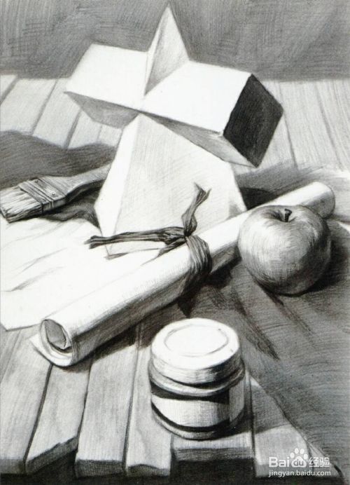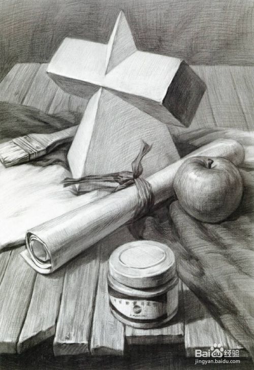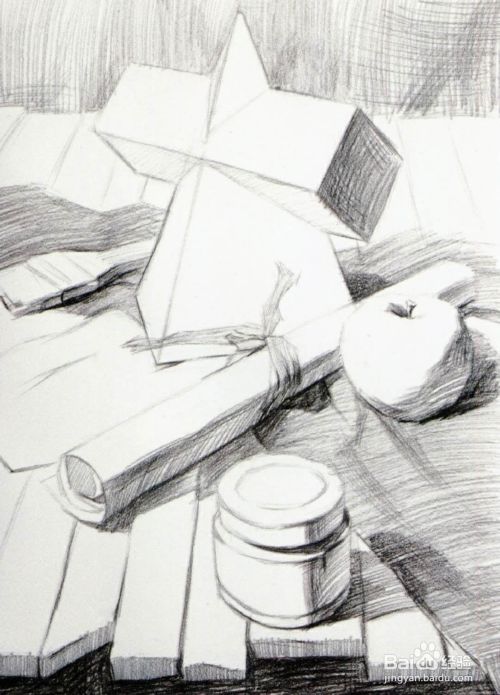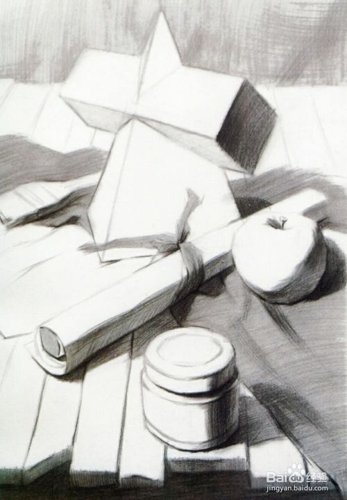 第五步:素描静物作品呈现。在这一步我们更侧重于完善画面的不足以达到最终的画面完整效果。在深入刻画物体的具体细节的时候我们切忌死扣某一个物体的具体细节,否则会使画面不协调,影响整体的画面关系。深入刻画也是整张画面一起进行,从主到次的去刻画物体,慢慢的使副主体物也跟上整体的画面效果。
