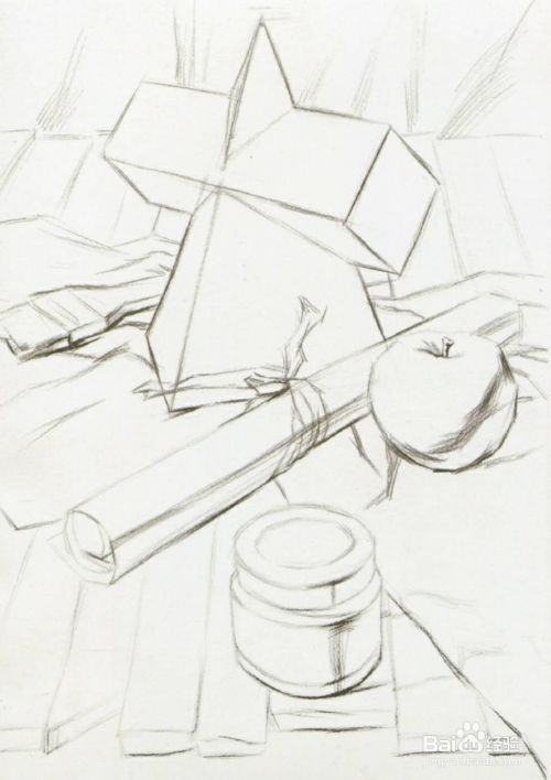 第一步:素描静物起型。我们可以看到的是,在这幅画中主次关系很分明(尽管是只起型)。首先要考虑到的是静物之间的物体比例关系、整张画面的构图关系。