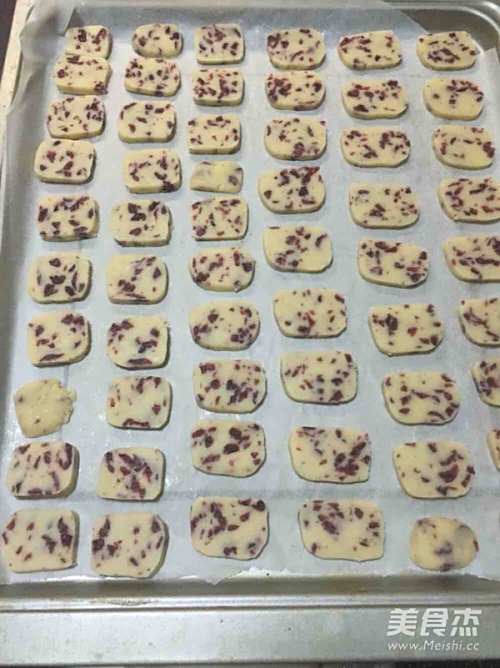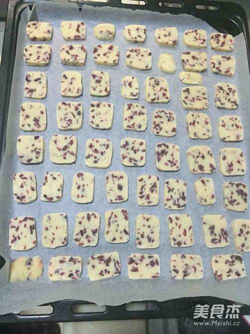 6半小时后,烤箱预热170度、十分钟,烤盘放油纸放入从冰箱里拿出来的切了片的蔓越莓饼干