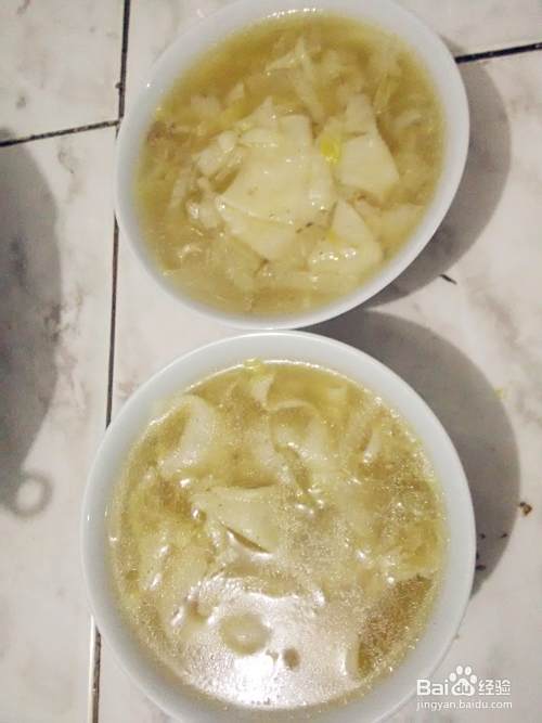 等锅中的汤烧开了,将面片抻长了,放入锅中,每一个面片都抻长了,放入锅中。