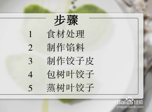 一、食材处理 二、制作馅料 三、制作饺子皮 四、包树叶饺子 五、蒸树叶饺子