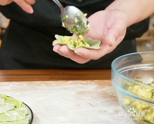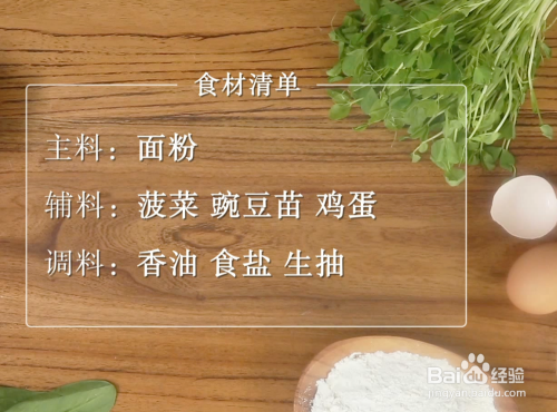 准备材料:面粉 菠菜 豌豆苗 鸡蛋 香油 食盐 生抽