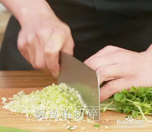 首先我们处理豌豆苗 将豌豆苗全部切碎 切成丁状