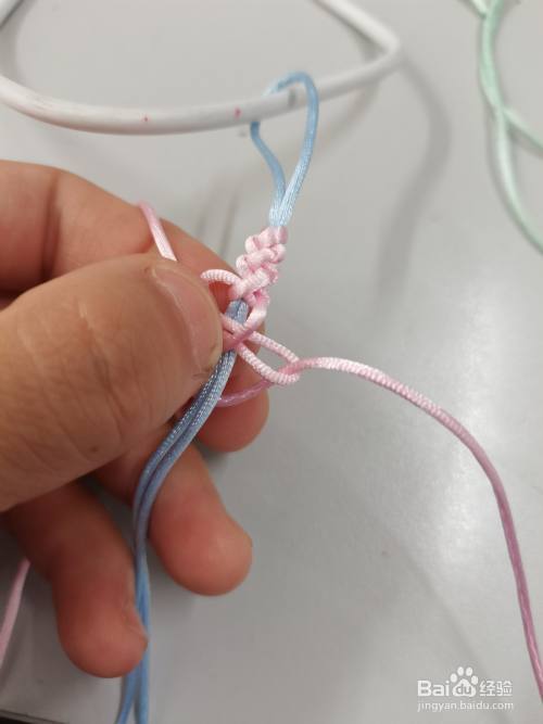 将左边的绳从上面绕一下,再回去,右边的绳从上面绕过,从下面穿过刚才的孔