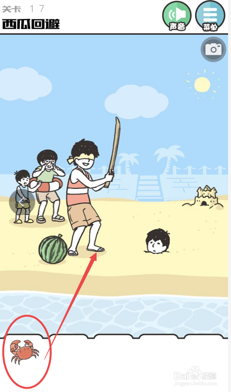 螃蟹会弄疼小朋友,这样挥舞刀的小朋友就会向西瓜的方向倒下。