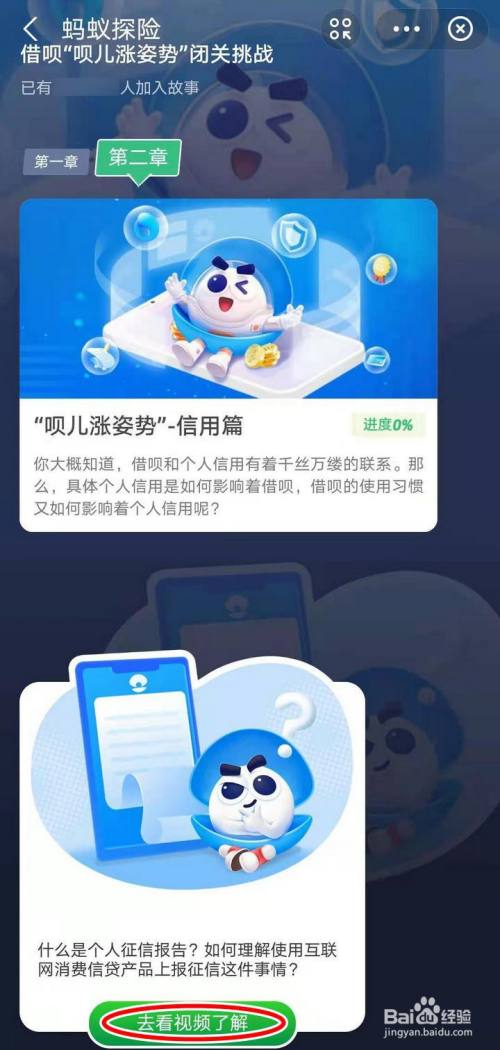 打开借呗闭关挑战页面,第二章是呗儿涨姿势信用篇,第一话是关于征信报告的,选择去看视频了解;