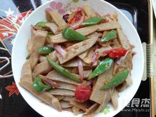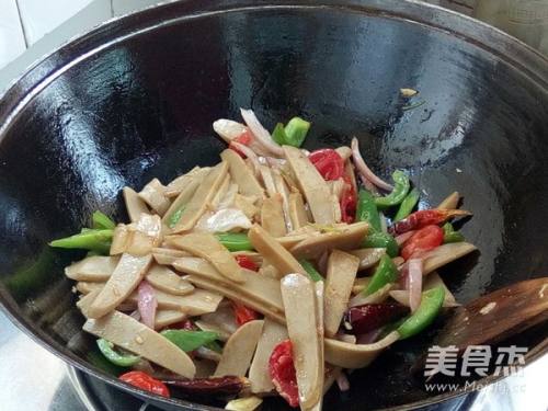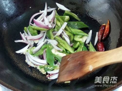 11煸炒香辣椒和八角,加入配菜煸炒。