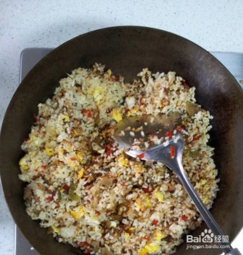 倒入鸡蛋液,快速翻炒,使鸡蛋包裹住每一粒米,炒饭呈金黄色。