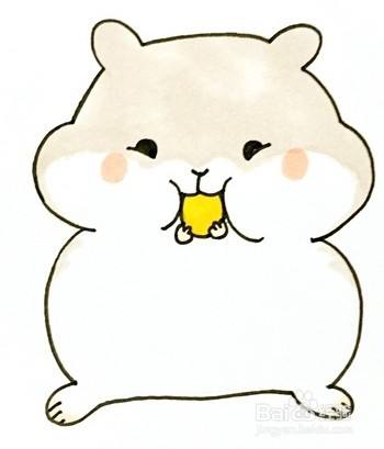首先画出小仓鼠的头部轮廓,接着画出它的身体轮廓,整个身体的轮廓都是胖胖的,最后画出小仓鼠的五官,正在吃东西,最后给仓鼠头部上半部分涂上浅咖色,画上浅粉色腮红,可爱的卡通小仓鼠简笔画就完成啦!