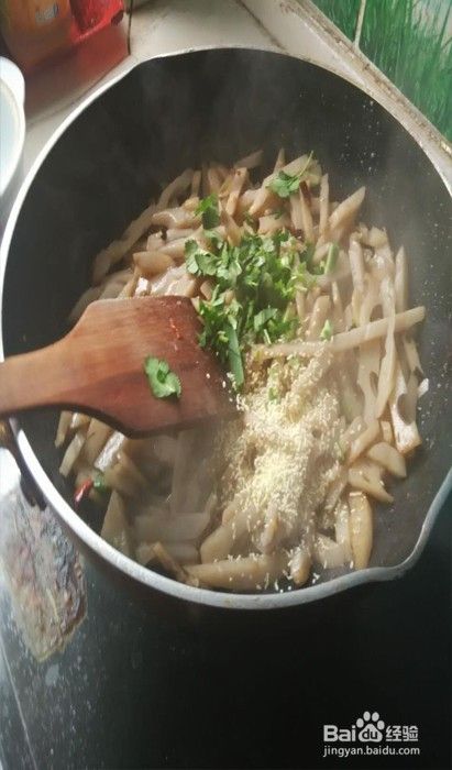 尝过之后感觉差不多的话,就可以准备放香菜了,香菜主要用来提味的。也用来提色的,绿绿的点缀一下菜品。南方人可能不太习惯放香菜,如果不喜欢可以不放,不影响菜的口感。最后再来点鸡精就可以了。