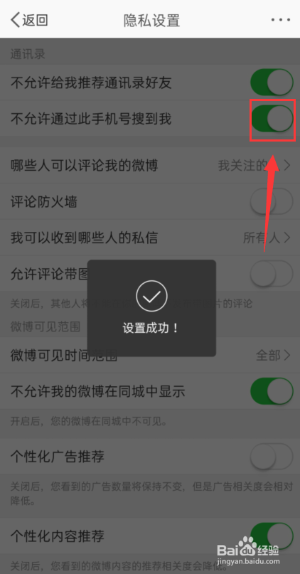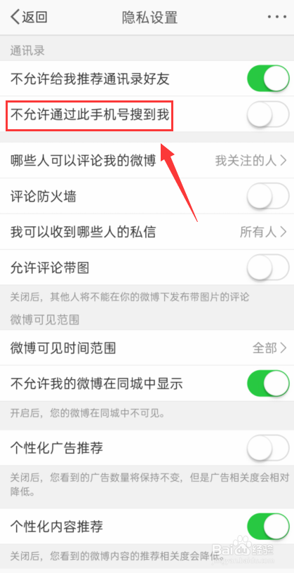 最后我们把【不允许通过此手机号搜到我】右边的【按钮】打开即可。