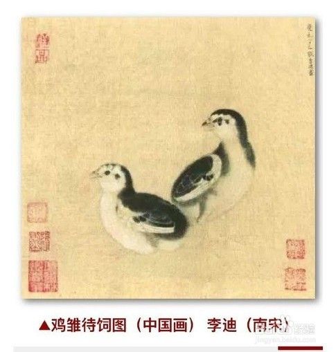 第一幅像《鸡雏待饲图》画面描绘了两只雏鸡背向而立,却一同望着画面的左方,画家用精细的笔法描绘,工致与意趣兼备,十分耐看。