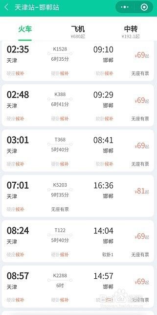 然后点击查询,就能看到天津到邯郸的火车时刻表了,这时候你可以根据自己的时间来选择出行时间。