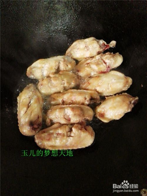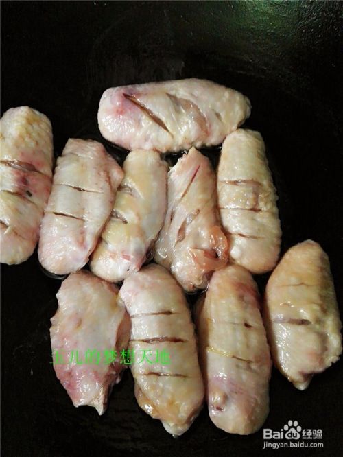 锅放油烧热,把腌好的鸡中翅放进锅里中火煎。