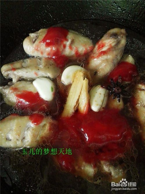 放入番茄酱,可以放多一点,大蒜生姜八角也放进去,加刚好盖住鸡中翅的水,盖好煮十五钟左右。