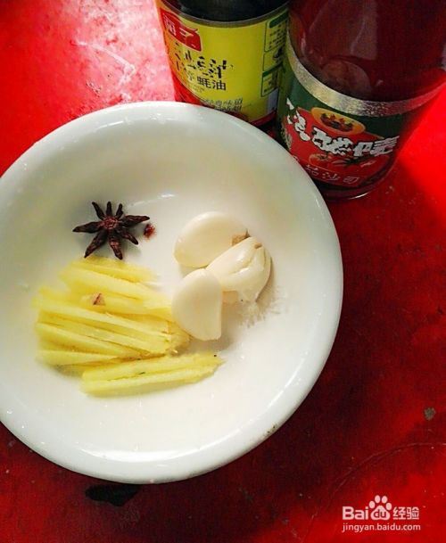 准备好配料。生姜切成丝,大蒜籽用刀背拍一下。