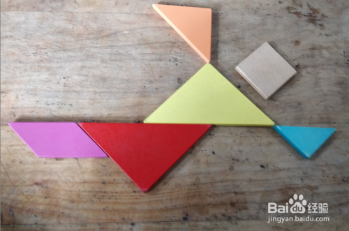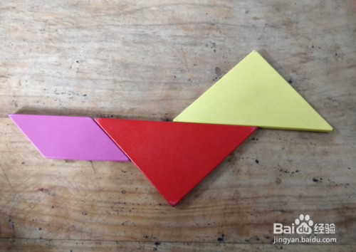 摆上黄色三角形,放在红色三角形的右上挨着,如图。