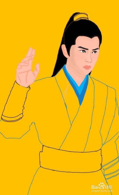 米色画笔画出人物的脖颈,蓝色和深蓝色画笔勾勒出男子的服装轮廓。黑色画笔画出男子的袖口和腰带装饰。