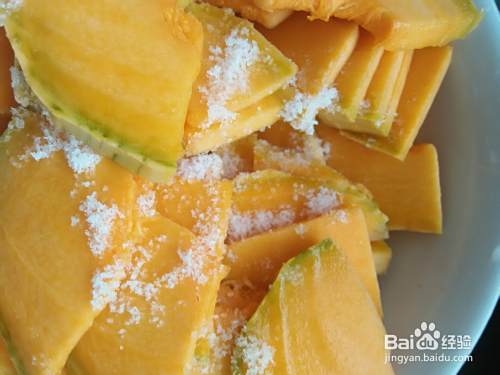 在均匀的放点盐在表明,如果喜欢甜品的话可以放点白糖,如果想减肥或者给三高人群、老年人食用的话,可以什么都不放,南瓜本身就有甜味。