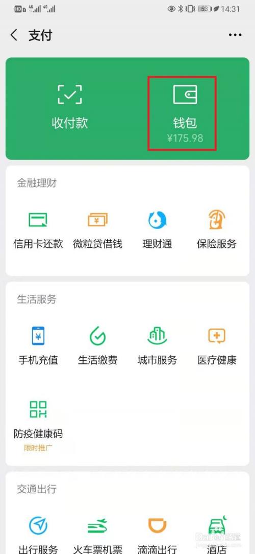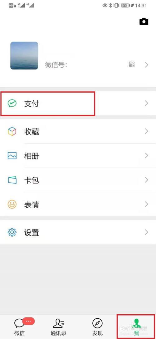 手机上打开【微信】后,依次打开【我的->支付】,如下图所示。