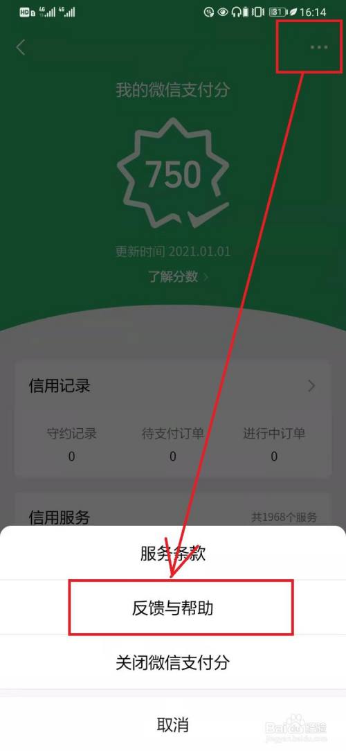 进入支付分信息页面,打开右上角【更多】菜单,在菜单窗口选项【反馈与帮助】选项,如下图所示。