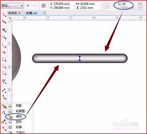 用“调和”工具调和出效果,按空格键切换为“选择工具”,框选矩形并按Ctrl+G组合对象,移动旋转图形至圆形处,如下图所示: