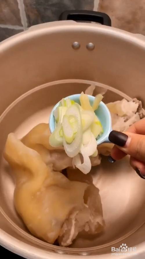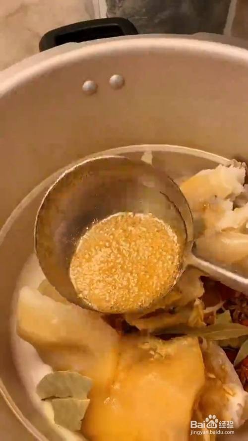 焯好的牛皮筋,放入高压锅,放入葱姜蒜,一勺酱油,一勺蚝油,2克桂皮,2克八角,2克香叶,一勺盐鸡精