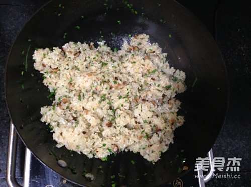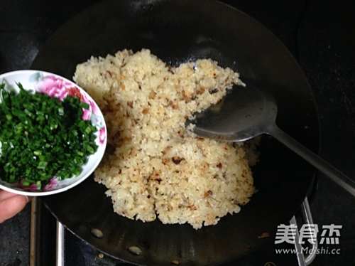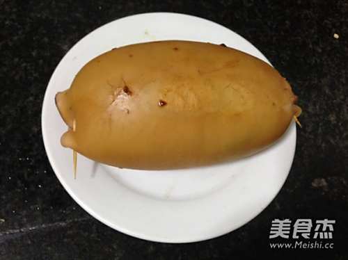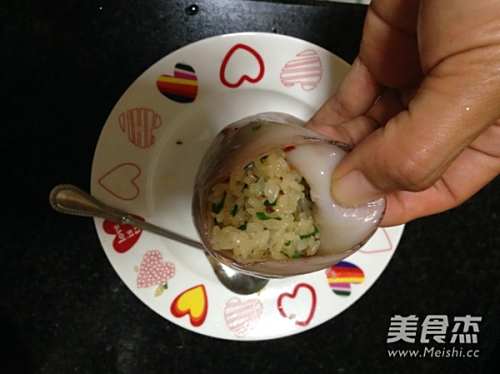 9鱿鱼尾部切断,用牙签穿好封口。把炒好的糯米饭塞入鱿鱼体内